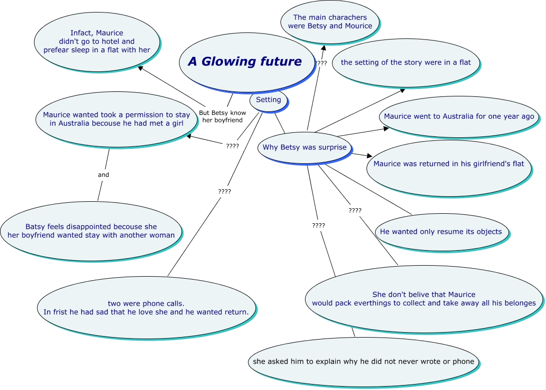 Questa Mappa Concettuale ha informazioni correlate a: A glowing future, Setting ???? Maurice was returned in his girlfriend's flat, Why Betsy was surprise ???? The main charachers were Betsy and Mourice, Setting ???? Maurice went to Australia for one year ago, Setting ???? He wanted only resume its objects, Why Betsy was surprise ???? She don't belive that Maurice would pack everthings to collect and take away all his belonges, Setting ???? two were phone calls. In frist he had sad that he love she and he wanted return., Setting ???? Maurice wanted took a permission to stay in Australia becouse he had met a girl, A Glowing future ???? Setting, A Glowing future But Betsy know her boyfriend Infact, Maurice didn't go to hotel and prefear sleep in a flat with her, Why Betsy was surprise ???? she asked him to explain why he did not never wrote or phone, Setting ???? the setting of the story were in a flat, Maurice wanted took a permission to stay in Australia becouse he had met a girl and Batsy feels disappointed becouse she her boyfriend wanted stay with another woman