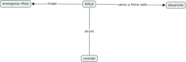 Questa Mappa Concettuale ha informazioni correlate a: rifiuti, Rifiuti alcuni reciclati, Rifiuti vanno a finire nelle discariche, Rifiuti troppi emergenza rifiuti