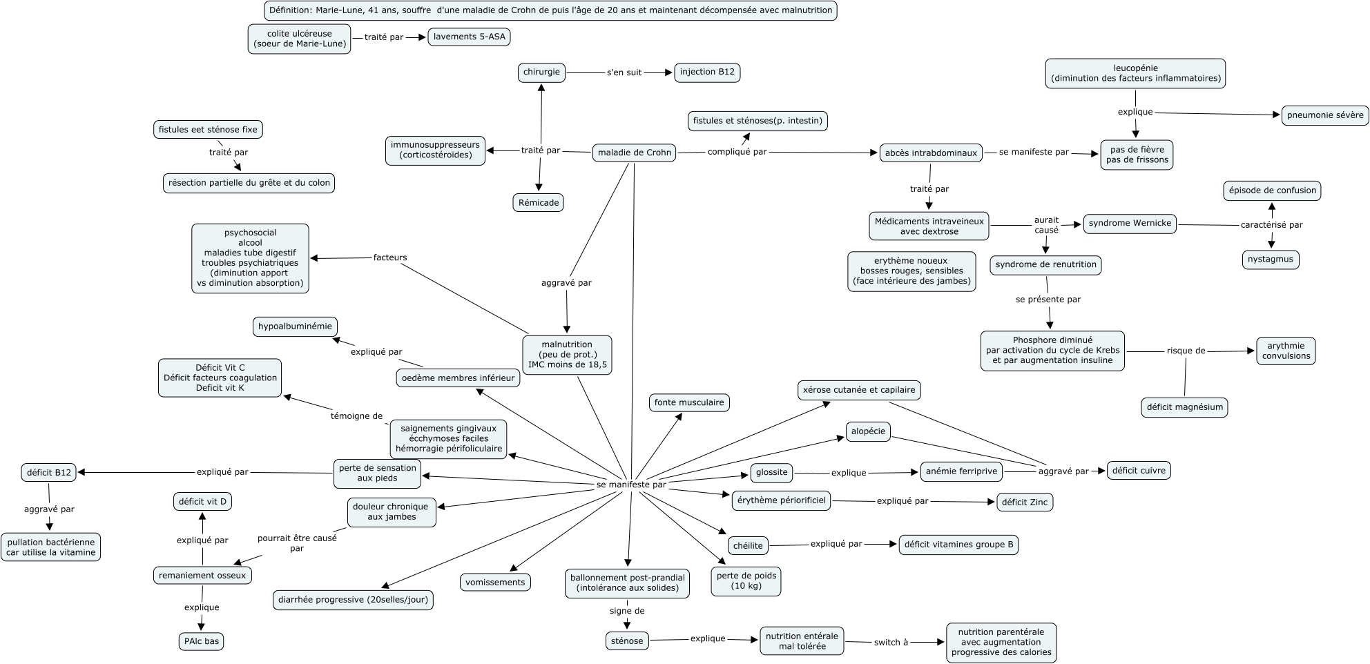 This Concept Map, created with IHMC CmapTools, has information related to: App 9 naif, abcès intrabdominaux traité par Médicaments intraveineux avec dextrose, malnutrition (peu de prot.) IMC moins de 18,5 se manifeste par perte de poids (10 kg), déficit B12 aggravé par pullation bactérienne car utilise la vitamine, malnutrition (peu de prot.) IMC moins de 18,5 se manifeste par glossite, maladie de Crohn se manifeste par perte de sensation aux pieds, maladie de Crohn aggravé par malnutrition (peu de prot.) IMC moins de 18,5, malnutrition (peu de prot.) IMC moins de 18,5 se manifeste par oedème membres inférieur, maladie de Crohn se manifeste par ballonnement post-prandial (intolérance aux solides), malnutrition (peu de prot.) IMC moins de 18,5 facteurs psychosocial alcool maladies tube digestif troubles psychiatriques (diminution apport vs diminution absorption), malnutrition (peu de prot.) IMC moins de 18,5 se manifeste par saignements gingivaux écchymoses faciles hémorragie périfoliculaire, malnutrition (peu de prot.) IMC moins de 18,5 se manifeste par fonte musculaire, oedème membres inférieur expliqué par hypoalbuminémie, malnutrition (peu de prot.) IMC moins de 18,5 se manifeste par vomissements, remaniement osseux explique PAlc bas, maladie de Crohn traité par chirurgie, xérose cutanée et capilaire aggravé par déficit cuivre, remaniement osseux expliqué par déficit vit D, Médicaments intraveineux avec dextrose aurait causé syndrome Wernicke, Phosphore diminué par activation du cycle de Krebs et par augmentation insuline risque de arythmie convulsions, maladie de Crohn se manifeste par diarrhée progressive (20selles/jour)