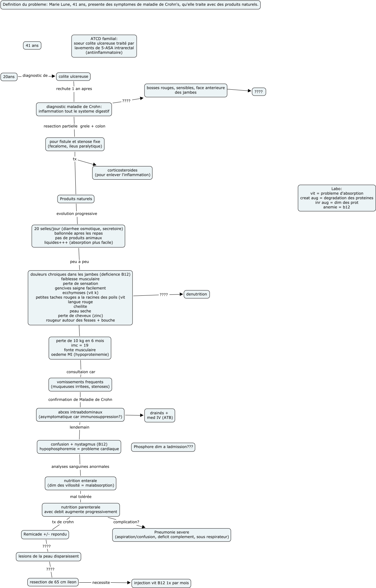 This Concept Map, created with IHMC CmapTools, has information related to: APP9 naif, nutrition enterale (dim des villosité = malabsorption) mal tolérée nutrition parenterale avec debit augmente progressivement, nutrition parenterale avec debit augmente progressivement tx de crohn Remicade +/- repondu, resection de 65 cm ileon necessite injection vit B12 1x par mois, lesions de la peau disparaissent ???? resection de 65 cm ileon, 20ans diagnostic de colite ulcereuse, diagnostic maladie de Crohn: inflammation tout le systeme digestif resection partielle grele + colon pour fistule et stenose fixe (fecalome, ileus paralytique), 20 selles/jour (diarrhee osmotique, secretoire) ballonnée apres les repas pas de produits animaux liquides+++ (absorption plus facile) peu a peu douleurs chroiques dans les jambes (deficience B12) faiblesse musculaire perte de sensation gencives saigne facilement ecchymoses (vit k) petites taches rouges a la racines des poils (vit langue rouge cheilite peau seche perte de cheveux (zinc) rougeur autour des fesses + bouche, Produits naturels evolution progressive 20 selles/jour (diarrhee osmotique, secretoire) ballonnée apres les repas pas de produits animaux liquides+++ (absorption plus facile), nutrition parenterale avec debit augmente progressivement complication? Pneumonie severe (aspiration/confusion, deficit complement, sous respirateur), pour fistule et stenose fixe (fecalome, ileus paralytique) tx corticosteroides (pour enlever l'inflammation), douleurs chroiques dans les jambes (deficience B12) faiblesse musculaire perte de sensation gencives saigne facilement ecchymoses (vit k) petites taches rouges a la racines des poils (vit langue rouge cheilite peau seche perte de cheveux (zinc) rougeur autour des fesses + bouche ???? denutrition, Remicade +/- repondu ???? lesions de la peau disparaissent, abces intraabdominaux (asymptomatique car immunosuppression?) ???? drainés + med IV (ATB), confusion + nystagmus (B12) hypophosphoremie = probleme cardiaque analyses sanguines anormales nutrition enterale (dim des villosité = malabsorption), douleurs chroiques dans les jambes (deficience B12) faiblesse musculaire perte de sensation gencives saigne facilement ecchymoses (vit k) petites taches rouges a la racines des poils (vit langue rouge cheilite peau seche perte de cheveux (zinc) rougeur autour des fesses + bouche ???? perte de 10 kg en 6 mois imc = 19 fonte musculaire oedeme MI (hypoproteinemie), abces intraabdominaux (asymptomatique car immunosuppression?) lendemain confusion + nystagmus (B12) hypophosphoremie = probleme cardiaque, bosses rouges, sensibles, face anterieure des jambes ???? ????, vomissements frequents (muqueuses irritees, stenoses) confirmation de Maladie de Crohn abces intraabdominaux (asymptomatique car immunosuppression?), perte de 10 kg en 6 mois imc = 19 fonte musculaire oedeme MI (hypoproteinemie) consultaion car vomissements frequents (muqueuses irritees, stenoses), colite ulcereuse rechute 1 an apres diagnostic maladie de Crohn: inflammation tout le systeme digestif