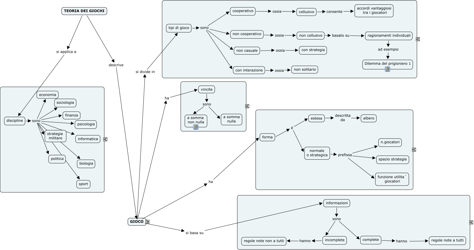 Questa Mappa Concettuale ha informazioni correlate a: TEORIA DEI GIOCHI, giocatori vogliono massimizzare vincite, tipi di gioco sono con interazione, giocatori sono razionali, forma é normale o strategica, informazioni sono incomplete, tipi di gioco sono non casuale, forma é estesa, GIOCO si basa su informazioni, preferenze coerenti ottimizzano esiti gioco, discipline sono sport, complete hanno regole note a tutti, non casuale ossia con strategia, ragionamenti individuali ad esempio Dilemma del prigioniero 1, discipline sono psicologia, non casuale ossia con strategia, TEORIA DEI GIOCHI si applica a discipline, tipi di gioco sono non cooperativo, normale o strategica prefissa funzione utilita´ giocatori, estesa descritta da albero, discipline sono sociologia