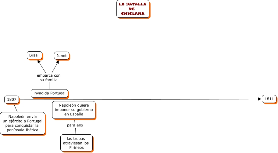 Este mapa conceptual tiene información relacionada a: Marina Jiménez Pérez Batalla de Chiclana, invadida Portugal embarca con su familia Junot, 1807 1811, 1807 Napoleón envía un ejército a Portugal para conquistar la península Ibérica, Napoleón quiere imponer su gobierno en España para ello las tropas atraviesan los Pirineos, invadida Portugal embarca con su familia Brasil