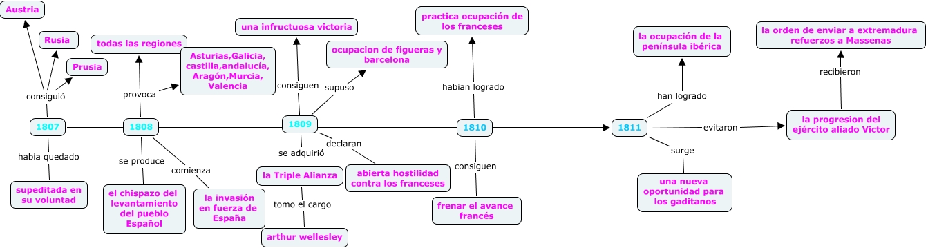 Este mapa conceptual tiene información relacionada a: 18-Milagros Moreno García- batalla de chiclana, 1808 provoca todas las regiones, 1807 consiguió Austria, 1807 consiguió Prusia, 1809 supuso ocupacion de figueras y barcelona, 1808 se produce el chispazo del levantamiento del pueblo Español, 1809 consiguen una infructuosa victoria, 1811 han logrado la ocupación de la península ibérica, 1808 provoca Asturias,Galicia, castilla,andalucía, Aragón,Murcia, Valencia, 1809 se adquirió la Triple Alianza, 1810 habian logrado practica ocupación de los franceses