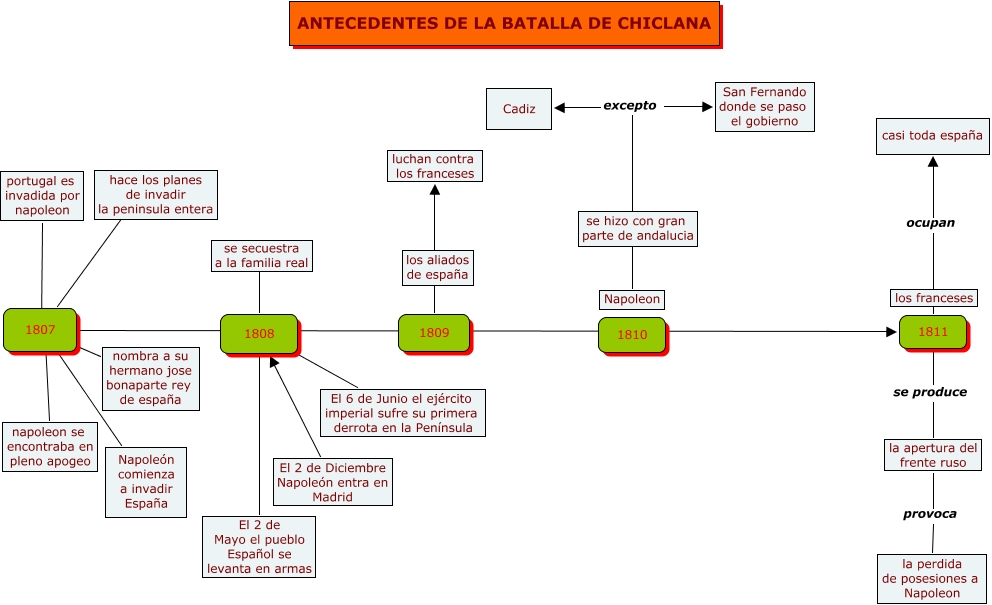 Este mapa conceptual tiene información relacionada a: 10.Juan Jesús Díaz Leal-Antecedentes de la batalla de Chiclana, Napoleon excepto Cadiz, El 2 de Diciembre Napoleón entra en Madrid 1808, napoleon se encontraba en pleno apogeo ???? 1807, nombra a su hermano jose bonaparte rey de españa ???? 1807, Napoleón comienza a invadir España ???? 1807, Napoleon excepto San Fernando donde se paso el gobierno, 1807 hace los planes de invadir la peninsula entera, 1811 ocupan casi toda españa, 1807 1811, 1811 se produce la apertura del frente ruso