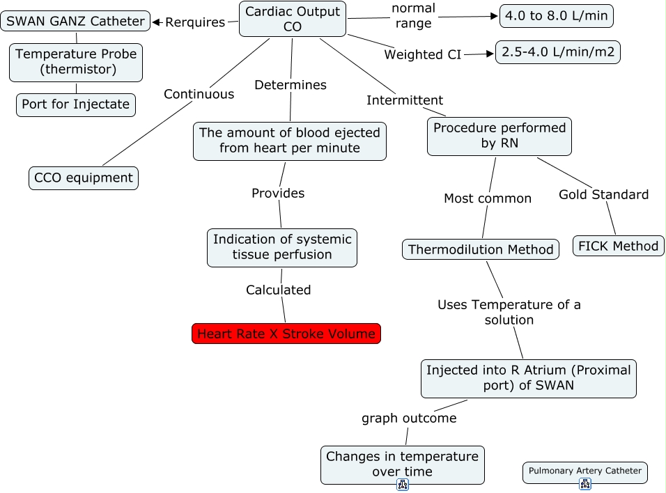 This Concept Map has information related to: Cardiac Output, SWAN GANZ Catheter ???? Temperature Probe (thermistor), Cardiac Output CO normal range 4.0 to 8.0 L/min, Procedure performed by RN Most common Thermodilution Method, Indication of systemic tissue perfusion Calculated Heart Rate X Stroke Volume, Procedure performed by RN Gold Standard FICK Method, Cardiac Output CO Continuous CCO equipment, Injected into R Atrium (Proximal port) of SWAN graph outcome Changes in temperature over time, Thermodilution Method Uses Temperature of a solution Injected into R Atrium (Proximal port) of SWAN, Cardiac Output CO Determines The amount of blood ejected from heart per minute, Cardiac Output CO Weighted CI 2.5-4.0 L/min/m2