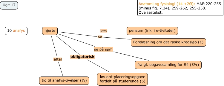 This Concept Map has information related to: TVO-2 uge 17, hjerte aftal tid til anafys-øvelser (½), hjerte se på spm fra gl. opgavesamling for S4 (3½), hjerte se Forelæsning om det raske kredsløb (1), 10 anafys hjerte, hjerte læs pensum (inkl i e-tiviteter), hjerte obligatorisk løs ord-placeringsopgave fordelt på studerende (5)