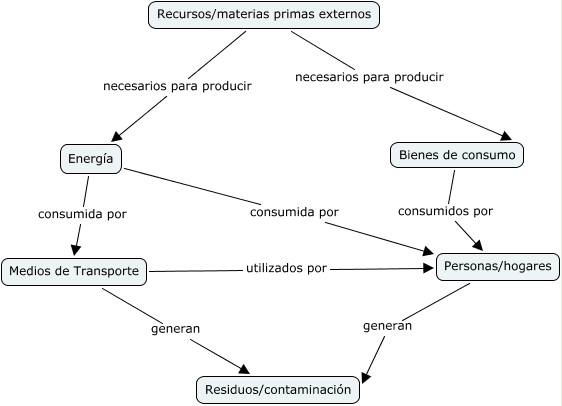 Este mapa conceptual tiene información relacionada a: ciudad, Recursos/materias primas externos necesarios para producir Energía, Recursos/materias primas externos necesarios para producir Bienes de consumo, Personas/hogares generan Residuos/contaminación, Medios de Transporte generan Residuos/contaminación, Energía consumida por Medios de Transporte, Bienes de consumo consumidos por Personas/hogares, Medios de Transporte utilizados por Personas/hogares, Energía consumida por Personas/hogares