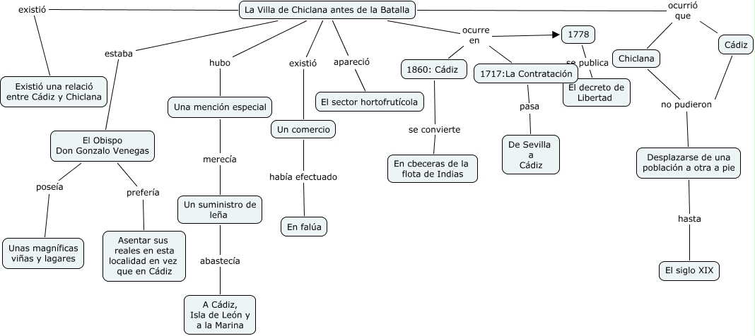 Este mapa conceptual tiene información relacionada a: 01.Paloma Acosta Aguilar.Chiclana antes de la batalla, 1717:La Contratación pasa De Sevilla a Cádiz, El Obispo Don Gonzalo Venegas prefería Asentar sus reales en esta localidad en vez que en Cádiz, La Villa de Chiclana antes de la Batalla ocurrió que Cádiz, La Villa de Chiclana antes de la Batalla ocurre en 1778, La Villa de Chiclana antes de la Batalla hubo Una mención especial, 1860: Cádiz se convierte En cbeceras de la flota de Indias, La Villa de Chiclana antes de la Batalla existió Existió una relació entre Cádiz y Chiclana, Una mención especial merecía Un suministro de leña, Cádiz no pudieron Desplazarse de una población a otra a pie, La Villa de Chiclana antes de la Batalla ocurre en 1717:La Contratación