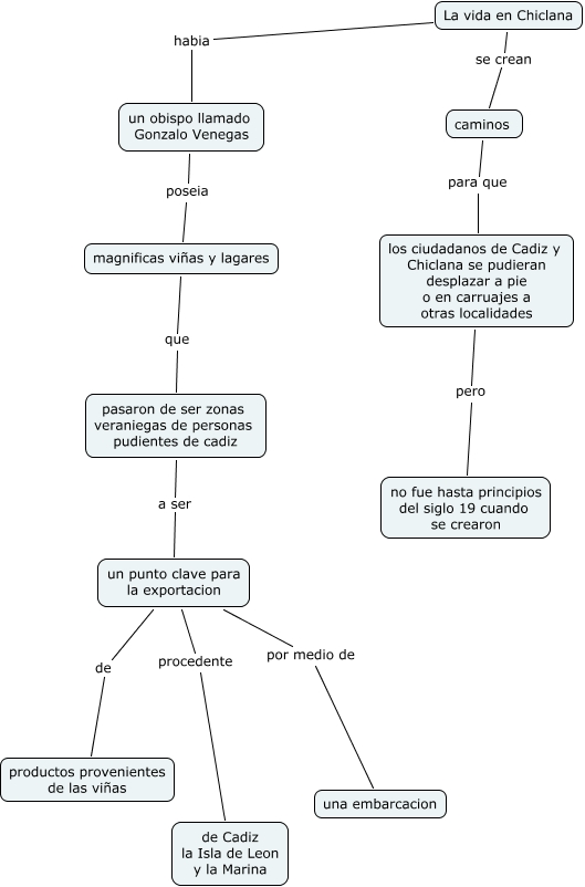 Este mapa conceptual tiene información relacionada a: 02.Marina Aragón de Lema.chiclana antes de la batalla, caminos para que los ciudadanos de Cadiz y Chiclana se pudieran desplazar a pie o en carruajes a otras localidades, un obispo llamado Gonzalo Venegas poseia magnificas viñas y lagares, La vida en Chiclana habia un obispo llamado Gonzalo Venegas, un punto clave para la exportacion por medio de una embarcacion, pasaron de ser zonas veraniegas de personas pudientes de cadiz a ser un punto clave para la exportacion, magnificas viñas y lagares que pasaron de ser zonas veraniegas de personas pudientes de cadiz, La vida en Chiclana se crean caminos, un punto clave para la exportacion de productos provenientes de las viñas, los ciudadanos de Cadiz y Chiclana se pudieran desplazar a pie o en carruajes a otras localidades pero no fue hasta principios del siglo 19 cuando se crearon, un punto clave para la exportacion procedente de Cadiz la Isla de Leon y la Marina