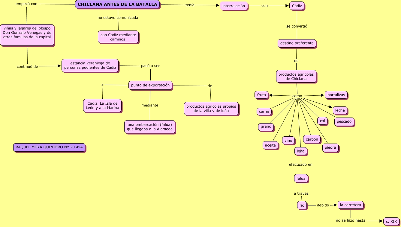 Este mapa conceptual tiene información relacionada a: 20.Raquel Moya Quintero, destino preferente de productos agrícolas de Chiclana, productos agrícolas de Chiclana como grano, productos agrícolas de Chiclana como cal, productos agrícolas de Chiclana como fruta, punto de exportación mediante una embarcación (falúa) que llegaba a la Alameda, punto de exportación a Cádiz, La Isla de León y a la Marina, productos agrícolas de Chiclana como pescado, productos agrícolas de Chiclana como hortalizas, interrelación con Cádiz, productos agrícolas de Chiclana como leña