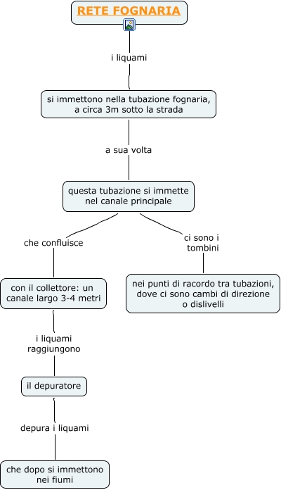Questa Mappa Concettuale ha informazioni correlate a: Rete fognaria, questa tubazione si immette nel canale principale ci sono i tombini nei punti di racordo tra tubazioni, dove ci sono cambi di direzione o dislivelli, RETE FOGNARIA i liquami si immettono nella tubazione fognaria, a circa 3m sotto la strada, questa tubazione si immette nel canale principale che confluisce con il collettore: un canale largo 3-4 metri, si immettono nella tubazione fognaria, a circa 3m sotto la strada a sua volta questa tubazione si immette nel canale principale, con il collettore: un canale largo 3-4 metri i liquami raggiungono il depuratore, il depuratore depura i liquami che dopo si immettono nei fiumi