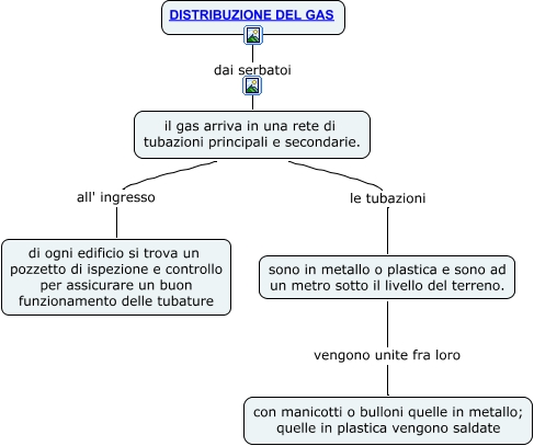 Questa Mappa Concettuale ha informazioni correlate a: Distribuzione del gas, il gas arriva in una rete di tubazioni principali e secondarie. all' ingresso di ogni edificio si trova un pozzetto di ispezione e controllo per assicurare un buon funzionamento delle tubature, sono in metallo o plastica e sono ad un metro sotto il livello del terreno. vengono unite fra loro con manicotti o bulloni quelle in metallo; quelle in plastica vengono saldate, il gas arriva in una rete di tubazioni principali e secondarie. le tubazioni sono in metallo o plastica e sono ad un metro sotto il livello del terreno., DISTRIBUZIONE DEL GAS dai serbatoi il gas arriva in una rete di tubazioni principali e secondarie.