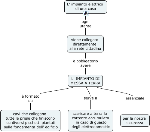 Questa Mappa Concettuale ha informazioni correlate a: impianto di una casa, L' IMPIANTO DI MESSA A TERRA serve a scaricare a terra la corrente accumulata in caso di guasto degli elettrodomestici, viene collegato direttamente alla rete cittadina è obbligatorio avere L' IMPIANTO DI MESSA A TERRA, L' impianto elettrico di una casa ogni utente viene collegato direttamente alla rete cittadina, L' IMPIANTO DI MESSA A TERRA essenziale per la nostra sicurezza, L' IMPIANTO DI MESSA A TERRA è formato da cavi che collegano tutte le prese che finiscono su diversi picchetti piantati sulle fondamenta dell' edificio