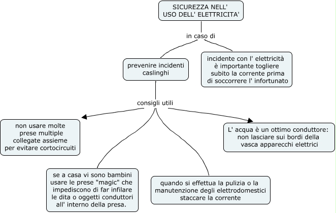 Questa Mappa Concettuale ha informazioni correlate a: sicurezza nell' uso della corrente, prevenire incidenti caslinghi consigli utili L' acqua è un ottimo conduttore: non lasciare sui bordi della vasca apparecchi elettrici, SICUREZZA NELL' USO DELL' ELETTRICITA' in caso di prevenire incidenti caslinghi, prevenire incidenti caslinghi consigli utili quando si effettua la pulizia o la manutenzione degli elettrodomestici staccare la corrente, prevenire incidenti caslinghi consigli utili se a casa vi sono bambini usare le prese "magic" che impediscono di far infilare le dita o oggetti conduttori all' interno della presa., prevenire incidenti caslinghi consigli utili non usare molte prese multiple collegate assieme per evitare cortocircuiti, SICUREZZA NELL' USO DELL' ELETTRICITA' in caso di incidente con l' elettricità è importante togliere subito la corrente prima di soccorrere l' infortunato