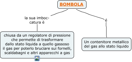 Questa Mappa Concettuale ha informazioni correlate a: Bombola, BOMBOLA la sua imboc- catura è chiusa da un regolatore di pressione che permette di trasformare dallo stato liquida a quello gassoso il gas per poterlo bruciare sui fornelli, scaldabagni e altri apparecchi a gas, BOMBOLA é Un contenitore metallico del gas allo stato liquido