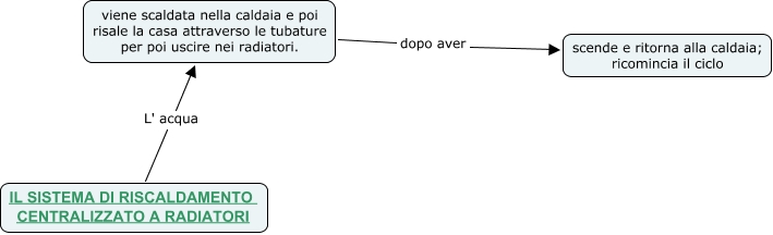 Questa Mappa Concettuale ha informazioni correlate a: Sistema centralizzato a radiatori, viene scaldata nella caldaia e poi risale la casa attraverso le tubature per poi uscire nei radiatori. dopo aver scende e ritorna alla caldaia; ricomincia il ciclo, IL SISTEMA DI RISCALDAMENTO CENTRALIZZATO A RADIATORI L' acqua viene scaldata nella caldaia e poi risale la casa attraverso le tubature per poi uscire nei radiatori.