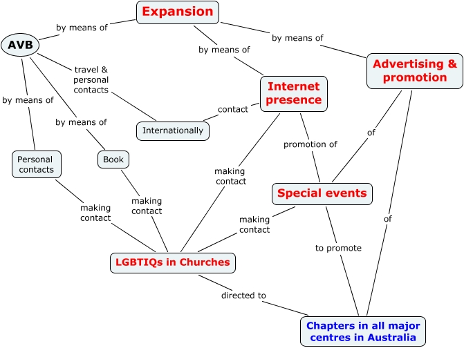 This Concept Map, created with IHMC CmapTools, has information related to: Expansion, Personal contacts making contact LGBTIQs in Churches, Special events making contact LGBTIQs in Churches, Expansion by means of Advertising & promotion, Advertising & promotion of Special events, AVB by means of Personal contacts, AVB travel & personal contacts Internationally, Internet presence promotion of Special events, Expansion by means of Internet presence, Expansion by means of AVB, Special events to promote Chapters in all major centres in Australia, LGBTIQs in Churches directed to Chapters in all major centres in Australia, Advertising & promotion of Chapters in all major centres in Australia, Internet presence contact Internationally, Internet presence making contact LGBTIQs in Churches, Book making contact LGBTIQs in Churches, AVB by means of Book