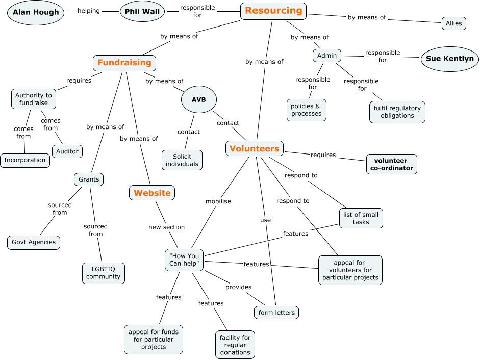 This Concept Map, created with IHMC CmapTools, has information related to: Resourcing, AVB contact Volunteers, Resourcing by means of Volunteers, Authority to fundraise comes from Incorporation, Volunteers requires volunteer co-ordinator, "How You Can help" features appeal for volunteers for particular projects, Resourcing by means of Fundraising, Fundraising by means of Website, Alan Hough helping Phil Wall, Volunteers use form letters, Resourcing by means of Admin, Grants sourced from Govt Agencies, "How You Can help" features list of small tasks, Volunteers respond to appeal for volunteers for particular projects, Fundraising by means of Grants, Sue Kentlyn responsible for Admin, Fundraising by means of AVB, "How You Can help" features appeal for funds for particular projects, Website new section "How You Can help", Grants sourced from LGBTIQ community, Fundraising requires Authority to fundraise
