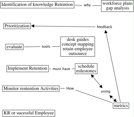 knowledge sharing DAvid Savage, evaluate tools desk guides concept mapping retain employee outsource, schedule milestones using metrics, Monitor rentention Activities How metrics, Implement Retention must have schedule milestones, metrics feedback Prioritization, Identification of knowledge Retention why workforce plans gap analysis