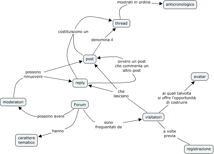 Forum, Forum sono frequentati da visitatori, post costituiscono un thread, reply costituiscono un thread, visitatori che lasciano post, Forum hanno carattere tematico, moderatori possono rimuovere post, visitatori a volte previa registrazione, reply ovvero un post che commenta un altro post post, post denomina il thread, moderatori possono rimuovere reply