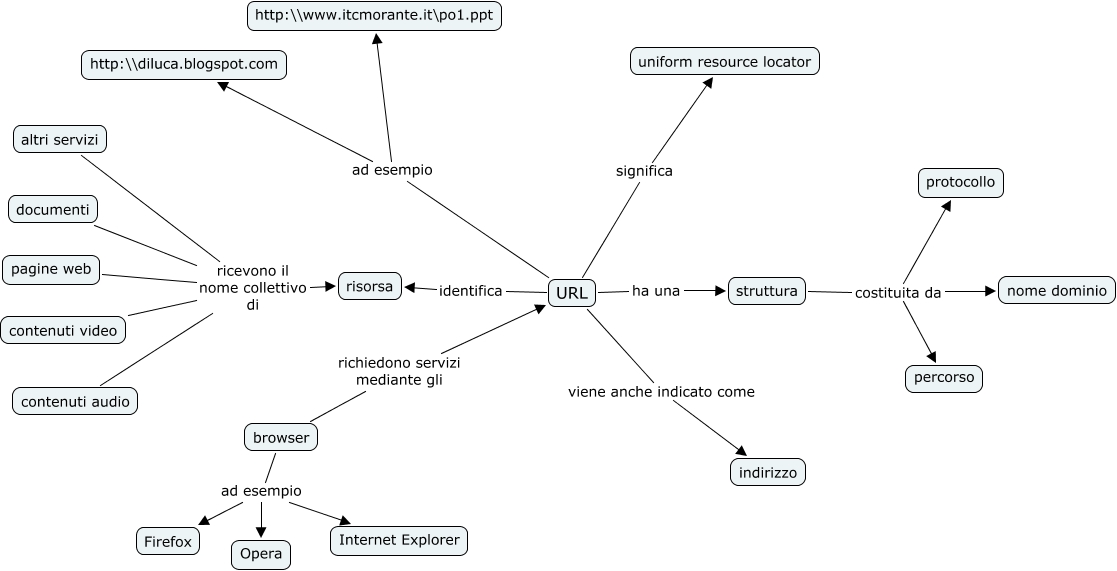 URL, browser ad esempio Opera, pagine web ricevono il nome collettivo di contenuti audio, altri servizi ricevono il nome collettivo di risorsa, URL significa uniform resource locator, URL ha una struttura, altri servizi ricevono il nome collettivo di contenuti video, pagine web ricevono il nome collettivo di risorsa, documenti ricevono il nome collettivo di contenuti audio, URL identifica risorsa, URL ad esempio http:\\www.itcmorante.it\po1.ppt