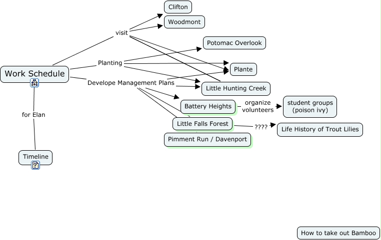 This Concept Map, created with IHMC CmapTools, has information related to: Work Schedule, Work Schedule Develope Management Plans Little Hunting Creek, Work Schedule Develope Management Plans Battery Heights, Work Schedule Planting Potomac Overlook, Work Schedule Planting Little Hunting Creek, Work Schedule Develope Management Plans Little Falls Forest, Battery Heights organize volunteers student groups (poison ivy), Work Schedule visit Plante, Work Schedule Planting Plante, Work Schedule visit Clifton, Work Schedule visit Little Hunting Creek, Little Falls Forest ???? Life History of Trout Lilies, Work Schedule for Elan Timeline, Work Schedule Develope Management Plans Plante, Work Schedule visit Woodmont, Work Schedule visit Little Hunting Creek, Work Schedule Develope Management Plans Pimment Run / Davenport