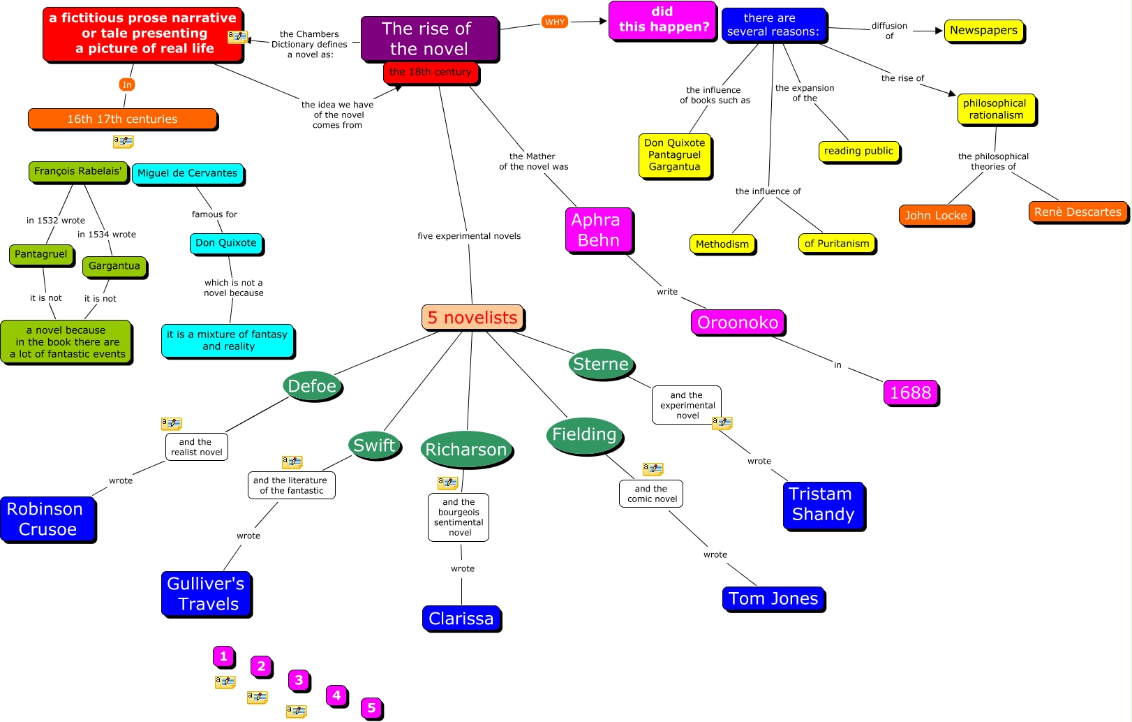 Questa Mappa Concettuale ha informazioni correlate a: The rise of the novel by Pandolfini, there are several reasons: the influence of Methodism, and the bourgeois sentimental novel wrote Clarissa, there are several reasons: the rise of philosophical rationalism, 5 novelists Defoe and the realist novel, 5 novelists Swift and the literature of the fantastic, The rise of the novel five experimental novels 5 novelists, 5 novelists Fielding and the comic novel, Gargantua it is not a novel because in the book there are a lot of fantastic events, philosophical rationalism the philosophical theories of Renè Descartes, there are several reasons: the influence of books such as Don Quixote Pantagruel Gargantua, 5 novelists Defoe and the realist novel, The rise of the novel the Mather of the novel was Aphra Behn, and the comic novel wrote Tom Jones, Don Quixote which is not a novel because it is a mixture of fantasy and reality, François Rabelais' in 1534 wrote Gargantua, philosophical rationalism the philosophical theories of John Locke, The rise of the novel WHY did this happen?, 5 novelists Sterne and the experimental novel, 5 novelists Richarson and the bourgeois sentimental novel, François Rabelais' in 1532 wrote Pantagruel