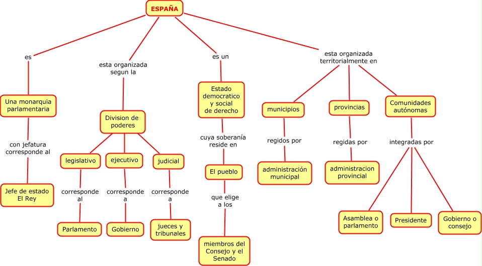 Este Cmap, tiene información relacionada con: Marina Rodríguez Gómez Nº 28 3ºB Tema11 Organizacion politica y territorial de españa, El pueblo que elige a los miembros del Consejo y el Senado, ejecutivo corresponde a Gobierno, judicial corresponde a jueces y tribunales, Comunidades autónomas integradas por Asamblea o parlamento, municipios regidos por administración municipal, judicial corresponde a jueces y tribunales, ESPAÑA esta organizada territorialmente en provincias, Una monarquia parlamentaria con jefatura corresponde al Jefe de estado El Rey, Division de poderes ???? ejecutivo, legislativo corresponde al Parlamento, ESPAÑA esta organizada segun la Division de poderes, Division de poderes ???? legislativo, Comunidades autónomas integradas por Presidente, Comunidades autónomas integradas por Gobierno o consejo, ESPAÑA esta organizada territorialmente en Comunidades autónomas, Division de poderes ???? judicial, provincias regidas por administracion provincial, Estado democratico y social de derecho cuya soberanía reside en El pueblo, ESPAÑA es Una monarquia parlamentaria, ESPAÑA es un Estado democratico y social de derecho