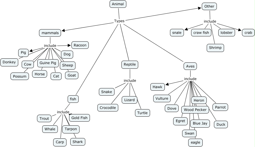 This Concept Map, created with IHMC CmapTools, has information related to: Animals, Reptile include Turtle, Other include crab, mammals include Horse, mammals include Dog, Other include lobster, Aves include Parrot, Reptile include Crocodile, Other include Shrimp, Aves include Vulture, mammals include Goat, Aves include Blue Jay, Aves include Swan, Animal Types Reptile, Reptile include Lizard, mammals include Cat, Aves include Dove, fish include Gold Fish, fish include Trout, Aves include Wood Pecker, Other include snale
