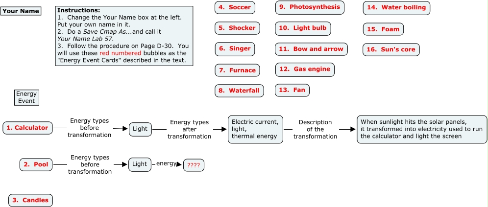 This Concept Map, created with IHMC CmapTools, has information related to: YourName Lab 58, Light energy ????, Light Energy types after transformation Electric current, light, thermal energy, 2. Pool Energy types before transformation Light, 1. Calculator Energy types before transformation Light, Electric current, light, thermal energy Description of the transformation When sunlight hits the solar panels, it transformed into electricity used to run the calculator and light the screen