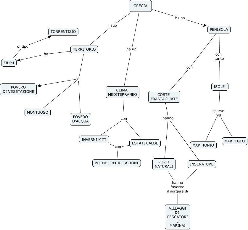 Questa Mappa Concettuale ha informazioni correlate a: T ERRITORIO GRECIA, PORTI NATURALI hanno favorito il sorgere di VILLAGGI DI PESCATORI E MARINAI, ISOLE sparse nel MAR EGEO, INSENATURE hanno favorito il sorgere di VILLAGGI DI PESCATORI E MARINAI, TERRITORIO è POVERO D'ACQUA, ESTATI CALDE con POCHE PRECIPITAZIONI, PENISOLA con tante ISOLE, GRECIA ha un CLIMA MEDITERRANEO, TERRITORIO è MONTUOSO, TERRITORIO è POVERO DI VEGETAZIONE, TERRITORIO ha FIUMI, INVERNI MITI con POCHE PRECIPITAZIONI, CLIMA MEDITERRANEO con INVERNI MITI, PENISOLA con COSTE FRASTAGLIATE, GRECIA è una PENISOLA, GRECIA il suo TERRITORIO, COSTE FRASTAGLIATE hanno INSENATURE, COSTE FRASTAGLIATE hanno PORTI NATURALI, CLIMA MEDITERRANEO con ESTATI CALDE, FIUMI di tipo TORRENTIZIO, ISOLE sparse nel MAR IONIO