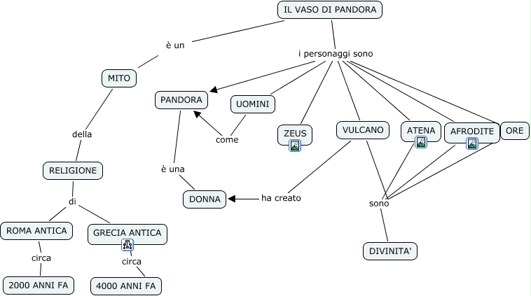 Questa Mappa Concettuale ha informazioni correlate a: il vaso di pandora, GRECIA ANTICA circa 4000 ANNI FA, RELIGIONE di GRECIA ANTICA, IL VASO DI PANDORA i personaggi sono ORE, RELIGIONE di ROMA ANTICA, IL VASO DI PANDORA i personaggi sono PANDORA, PANDORA è una DONNA, MITO della RELIGIONE, IL VASO DI PANDORA è un MITO, IL VASO DI PANDORA i personaggi sono ATENA, ATENA sono DIVINITA', IL VASO DI PANDORA i personaggi sono ZEUS, IL VASO DI PANDORA i personaggi sono UOMINI, UOMINI come PANDORA, IL VASO DI PANDORA i personaggi sono VULCANO, ORE sono DIVINITA', VULCANO sono DIVINITA', VULCANO ha creato DONNA, IL VASO DI PANDORA i personaggi sono AFRODITE, ROMA ANTICA circa 2000 ANNI FA, AFRODITE sono DIVINITA'