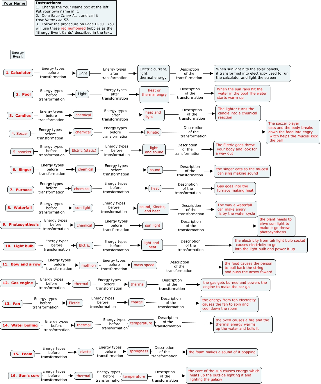 This Concept Map, created with IHMC CmapTools, has information related to: Jared Lab 58, elastic Energy types before transformation springness, mothion Energy types before transformation mass speed, temperature Description of the transformation the oven causes a fire and the thermal energy warms up the water and boils it, 10. Light bulb Energy types before transformation Elctric, 1. Calculator Energy types before transformation Light, Elctric (static) Energy types before transformation light and sound, 6. Singer Energy types before transformation chemical, 2. Pool Energy types before transformation Light, temperature Description of the transformation the core of the sun causes energy which heats up the outside lighting it and lighting the galaxy, sun light Description of the transformation the plant needs to ahve sun light to make it go threw photosynthesis, sun light Energy types before transformation sound, Kinetic, and heat, chemical Energy types before transformation heat, 11. Bow and arrow Energy types before transformation mothion, light and heat Description of the transformation the electricity from teh light bulb socket causes electricity to go into the light bulb and power it up, Light Energy types after transformation heat or thermal engry, 3. Candles Energy types before transformation chemical, thermal Description of the transformation the gas gets burned and powers the engine to make the car go, heat and light Description of the transformation The lighter turns the candle into a chemical reaction, Light Energy types after transformation Electric current, light, thermal energy, 16. Sun's core Energy types before transformation thermal