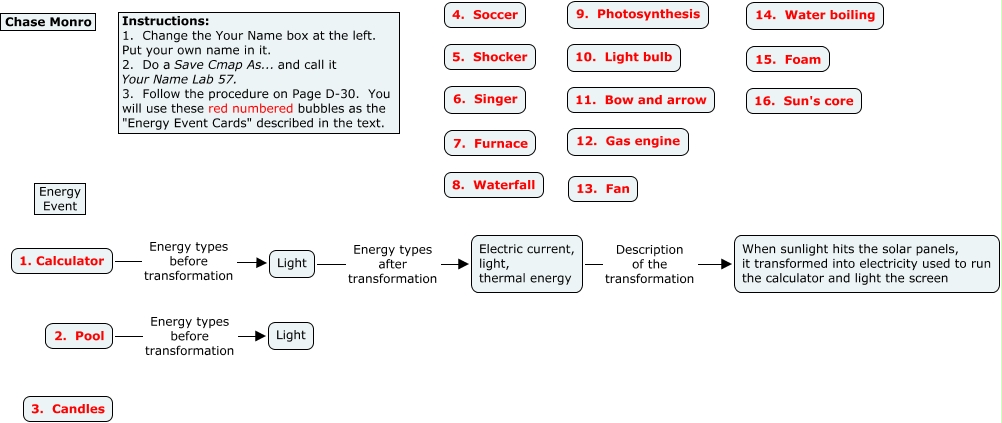 This Concept Map, created with IHMC CmapTools, has information related to: Chase Lab 58, Light Energy types after transformation Electric current, light, thermal energy, 2. Pool Energy types before transformation Light, 1. Calculator Energy types before transformation Light, Electric current, light, thermal energy Description of the transformation When sunlight hits the solar panels, it transformed into electricity used to run the calculator and light the screen