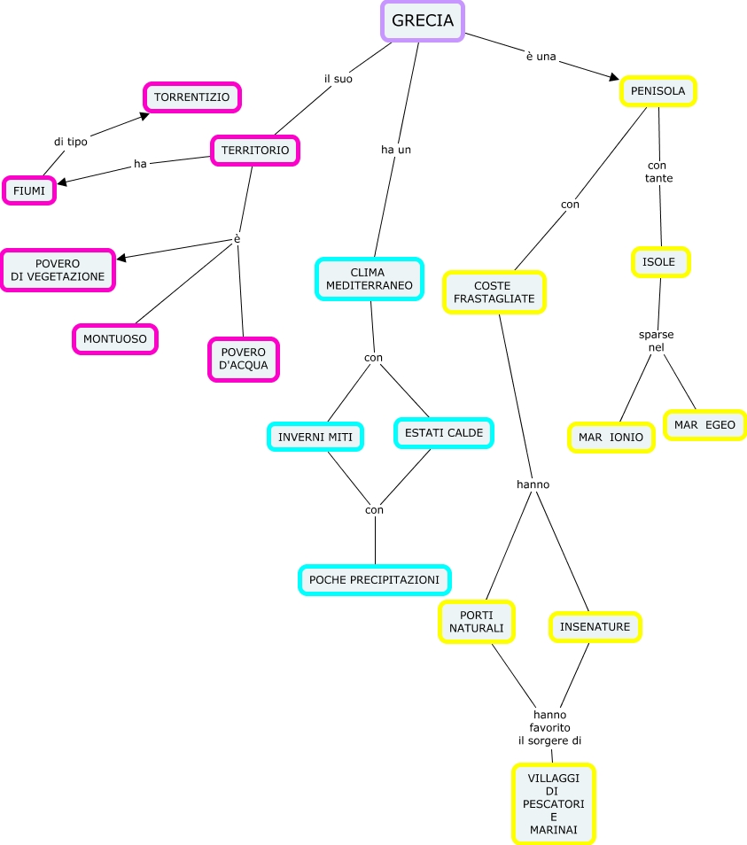 Questa Mappa Concettuale ha informazioni correlate a: T ERRITORIO GRECIA, PORTI NATURALI hanno favorito il sorgere di VILLAGGI DI PESCATORI E MARINAI, ISOLE sparse nel MAR EGEO, INSENATURE hanno favorito il sorgere di VILLAGGI DI PESCATORI E MARINAI, TERRITORIO è POVERO D'ACQUA, ESTATI CALDE con POCHE PRECIPITAZIONI, PENISOLA con tante ISOLE, GRECIA ha un CLIMA MEDITERRANEO, TERRITORIO è MONTUOSO, TERRITORIO è POVERO DI VEGETAZIONE, TERRITORIO ha FIUMI, INVERNI MITI con POCHE PRECIPITAZIONI, CLIMA MEDITERRANEO con INVERNI MITI, PENISOLA con COSTE FRASTAGLIATE, GRECIA è una PENISOLA, GRECIA il suo TERRITORIO, COSTE FRASTAGLIATE hanno INSENATURE, COSTE FRASTAGLIATE hanno PORTI NATURALI, CLIMA MEDITERRANEO con ESTATI CALDE, FIUMI di tipo TORRENTIZIO, ISOLE sparse nel MAR IONIO