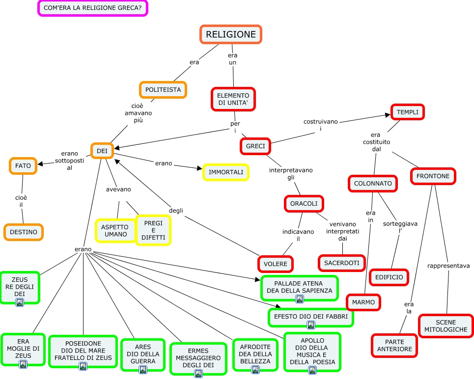 Questa Mappa Concettuale ha informazioni correlate a: religione greca, DEI erano POSEIDONE DIO DEL MARE FRATELLO DI ZEUS, ORACOLI indicavano il VOLERE, DEI erano AFRODITE DEA DELLA BELLEZZA, FATO cioè il DESTINO, RELIGIONE era un ELEMENTO DI UNITA', DEI erano IMMORTALI, GRECI interpretavano gli ORACOLI, FRONTONE era la PARTE ANTERIORE, ELEMENTO DI UNITA' per i DEI, DEI erano ARES DIO DELLA GUERRA, VOLERE degli DEI, FRONTONE rappresentava SCENE MITOLOGICHE, ELEMENTO DI UNITA' per i GRECI, DEI erano ERMES MESSAGGIERO DEGLI DEI, DEI avevano ASPETTO UMANO, ORACOLI venivano interpretati dai SACERDOTI, GRECI costruivano i TEMPLI, DEI erano EFESTO DIO DEI FABBRI, RELIGIONE era POLITEISTA, DEI avevano PREGI E DIFETTI
