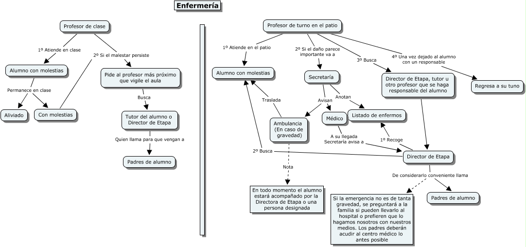 Enfermeria, Pide al profesor más próximo que vigile el aula Busca Tutor del alumno o Director de Etapa, Ambulancia (En caso de gravedad) Traslada Alumno con molestias, Secretaría Avisan Ambulancia (En caso de gravedad), Ambulancia (En caso de gravedad) Nota En todo momento el alumno estará acompañado por la Directora de Etapa o una persona designada, Director de Etapa De considerarlo conveniente llama Si la emergencia no es de tanta gravedad, se preguntará a la familia si pueden llevarlo al hospital o prefieren que lo hagamos nosotros con nuestros medios. Los padres deberán acudir al centro médico lo antes posible, Profesor de turno en el patio 2º Si el daño parece importante va a Secretaría, Alumno con molestias Permanece en clase Aliviado, Director de Etapa, tutor u otro profesor que se haga responsable del alumno ???? Director de Etapa, Profesor de turno en el patio 1º Atiende en el patio Alumno con molestias, Tutor del alumno o Director de Etapa Quien llama para que vengan a Padres de alumno