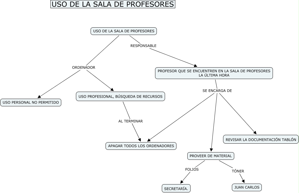 USO SALA DE PROFES, USO PROFESIONAL, BÚSQUEDA DE RECURSOS AL TERMINAR APAGAR TODOS LOS ORDENADORES, USO DE LA SALA DE PROFESORES ORDENADOR USO PROFESIONAL, BÚSQUEDA DE RECURSOS, PROFESOR QUE SE ENCUENTREN EN LA SALA DE PROFESORES LA ÚLTIMA HORA SE ENCARGA DE PROVEER DE MATERIAL, PROVEER DE MATERIAL TÓNER JUAN CARLOS, PROFESOR QUE SE ENCUENTREN EN LA SALA DE PROFESORES LA ÚLTIMA HORA SE ENCARGA DE REVISAR LA DOCUMENTACIÓN TABLÓN, USO DE LA SALA DE PROFESORES ORDENADOR USO PERSONAL NO PERMITIDO, PROFESOR QUE SE ENCUENTREN EN LA SALA DE PROFESORES LA ÚLTIMA HORA SE ENCARGA DE APAGAR TODOS LOS ORDENADORES, PROVEER DE MATERIAL FOLIOS SECRETARÍA., USO DE LA SALA DE PROFESORES RESPONSABLE PROFESOR QUE SE ENCUENTREN EN LA SALA DE PROFESORES LA ÚLTIMA HORA