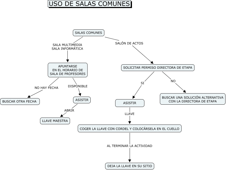 USO SALAS COMUNES, SALAS COMUNES SALA MULTIMEDIA SALA INFORMÁTICA APUNTARSE EN EL HORARIO DE SALA DE PROFESORES, APUNTARSE EN EL HORARIO DE SALA DE PROFESORES DISPONIBLE ASISTIR, SOLICITAR PERMISO DIRECTORA DE ETAPA NO BUSCAR UNA SOLUCIÓN ALTERNATIVA CON LA DIRECTORA DE ETAPA, SALAS COMUNES SALÓN DE ACTOS SOLICITAR PERMISO DIRECTORA DE ETAPA, SOLICITAR PERMISO DIRECTORA DE ETAPA SI ASISTIR, ASISTIR LLAVE COGER LA LLAVE CON CORDEL Y COLOCÁRSELA EN EL CUELLO, APUNTARSE EN EL HORARIO DE SALA DE PROFESORES NO HAY FECHA BUSCAR OTRA FECHA, ASISTIR ABRIR LLAVE MAESTRA, COGER LA LLAVE CON CORDEL Y COLOCÁRSELA EN EL CUELLO AL TERMINAR LA ACTIVIDAD DEJA LA LLAVE EN SU SITIO