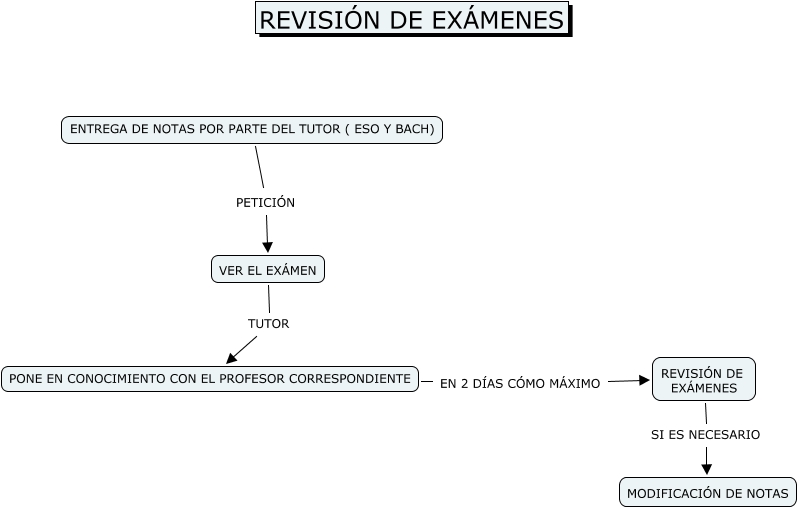 REVISIÓN DE EXÁMENES, VER EL EXÁMEN TUTOR PONE EN CONOCIMIENTO CON EL PROFESOR CORRESPONDIENTE, REVISIÓN DE EXÁMENES SI ES NECESARIO MODIFICACIÓN DE NOTAS, PONE EN CONOCIMIENTO CON EL PROFESOR CORRESPONDIENTE EN 2 DÍAS CÓMO MÁXIMO REVISIÓN DE EXÁMENES, ENTREGA DE NOTAS POR PARTE DEL TUTOR ( ESO Y BACH) PETICIÓN VER EL EXÁMEN