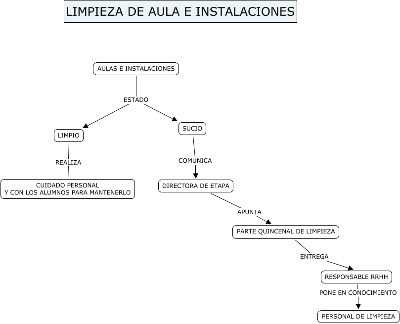 LIMPIEZA AULA, SUCIO COMUNICA DIRECTORA DE ETAPA, RESPONSABLE RRHH PONE EN CONOCIMIENTO PERSONAL DE LIMPIEZA, LIMPIO REALIZA CUIDADO PERSONAL Y CON LOS ALUMNOS PARA MANTENERLO, AULAS E INSTALACIONES ESTADO LIMPIO, AULAS E INSTALACIONES ESTADO SUCIO, PARTE QUINCENAL DE LIMPIEZA ENTREGA RESPONSABLE RRHH, DIRECTORA DE ETAPA APUNTA PARTE QUINCENAL DE LIMPIEZA