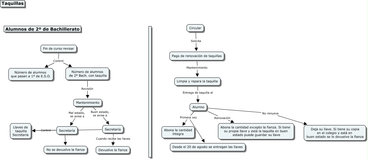 Taquilla, Fin de curso revisar Control Número de alumnos de 2º Bach. con taquilla, Fin de curso revisar Control Número de alumnos que pasan a 1º de E.S.O., Alumno Primera vez Desde el 20 de agosto se entregan las llaves, Secretaría ???? Llaves de taquilla Secretaría, Secretaría Cuando recibe las llaves Devuelve la fianza, Pago de renovación de taquillas Mantenimiento Limpia y repara la taquilla, Alumno Renovación Abona la cantidad excepto la fianza. Si tiene su propia llave y está la taquilla en buen estado puede guardar su llave, Mantenimiento Mal estado, se avisa a Secretaría, Número de alumnos de 2º Bach. con taquilla Revisión Mantenimiento, Limpia y repara la taquilla Entrega de taquilla al Alumno