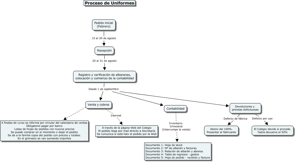 Uniformes, Venta y cobros ???? A finales de curso se informa por circular del calendario de ventas Obligatorio pagar por banco Listas de hojas de pedidos con nuevos precios Se puede comprar en el momento o dejar el pedido Se da a la familia copia del pedido con precios y totales. En el gimnasio se van sumando importes, Devoluciones y prendas defectuosas Defecto por uso El Colegio decide si procede. Yadra devuelve el 50%, Registro y verificación de albaranes, colocación y comienzo de la contabilidad Desde 1 de septiembre Contabilidad, Registro y verificación de albaranes, colocación y comienzo de la contabilidad Desde 1 de septiembre Venta y cobros, Pedido inicial (Febrero) 15 al 20 de agosto Recepción, Devoluciones y prendas defectuosas Defecto de fábrica Abono del 100%. Presentar al fabricante, Recepción 20 al 31 de agosto Registro y verificación de albaranes, colocación y comienzo de la contabilidad, Contabilidad Inventario trimestral (Interrumpe la venta) Documento 1: Hoja de stock Documento 2: Nº de albarán y facturas Documento 3: Relación de albarán y abonos Documento 4: Tabla de ingresos - gastos Documento 5: Hoja de pedido - recibido y factura, Venta y cobros Internet A través de la página Web del Colegio El pedido llega por mail directo a Secretaría Se comunica si está listo el pedido por la Web, Registro y verificación de albaranes, colocación y comienzo de la contabilidad Desde 1 de septiembre Devoluciones y prendas defectuosas