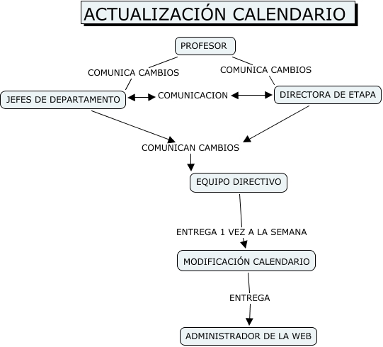 MODIFICACIÓN CALENDARIO, PROFESOR COMUNICA CAMBIOS JEFES DE DEPARTAMENTO, MODIFICACIÓN CALENDARIO ENTREGA ADMINISTRADOR DE LA WEB, JEFES DE DEPARTAMENTO COMUNICAN CAMBIOS EQUIPO DIRECTIVO, EQUIPO DIRECTIVO ENTREGA 1 VEZ A LA SEMANA MODIFICACIÓN CALENDARIO, DIRECTORA DE ETAPA COMUNICAN CAMBIOS EQUIPO DIRECTIVO, PROFESOR COMUNICA CAMBIOS DIRECTORA DE ETAPA, JEFES DE DEPARTAMENTO COMUNICACION DIRECTORA DE ETAPA