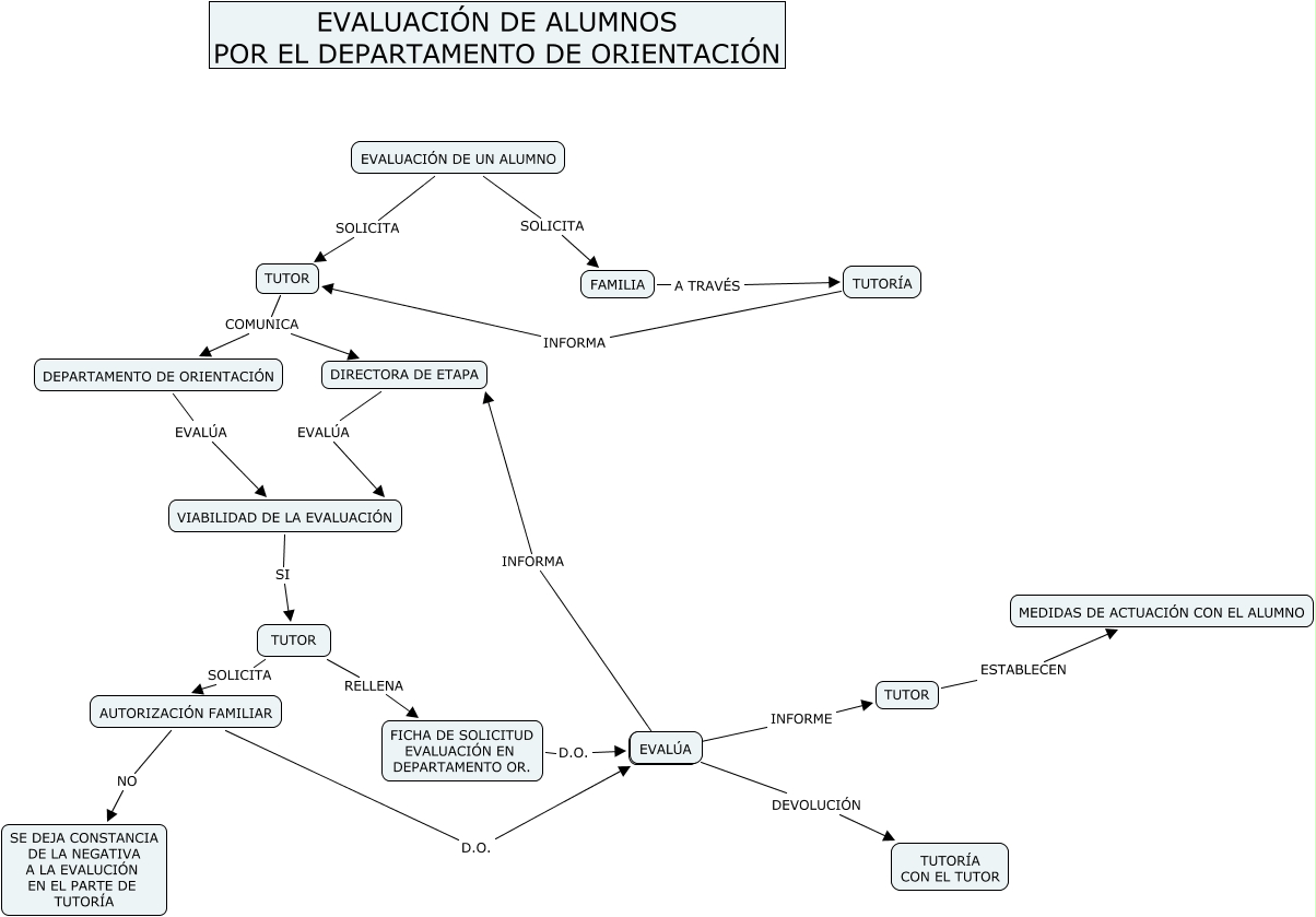 EVALUACION DO, FICHA DE SOLICITUD EVALUACIÓN EN DEPARTAMENTO OR. D.O. EVALÚA, FAMILIA A TRAVÉS TUTORÍA, TUTOR RELLENA FICHA DE SOLICITUD EVALUACIÓN EN DEPARTAMENTO OR., EVALÚA DEVOLUCIÓN TUTORÍA CON EL TUTOR, EVALÚA INFORMA DIRECTORA DE ETAPA, EVALUACIÓN DE UN ALUMNO SOLICITA FAMILIA, DEPARTAMENTO DE ORIENTACIÓN EVALÚA VIABILIDAD DE LA EVALUACIÓN, TUTOR COMUNICA DIRECTORA DE ETAPA, TUTORÍA INFORMA TUTOR, EVALÚA INFORME TUTOR