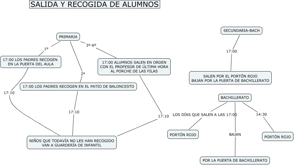 SALIDA Y RECOGIDA ALUMNOS, SECUNDARIA-BACH 17:00 SALEN POR EL PORTÓN ROJO BAJAN POR LA PUERTA DE BACHILLERATO, PRIMARIA 2º 17:00 LOS PADRES RECOGEN EN EL PATIO DE BALONCESTO, 17:00 ALUMNOS SALEN EN ORDEN CON EL PROFESOR DE ÚLTIMA HORA AL PORCHE DE LAS FILAS 17:10 NIÑOS QUE TODAVÍA NO LES HAN RECOGIDO VAN A GUARDERÍA DE INFANTIL, BACHILLERATO BAJAN POR LA PUERTA DE BACHILLERATO, 17:00 LOS PADRES RECOGEN EN EL PATIO DE BALONCESTO 17:10 NIÑOS QUE TODAVÍA NO LES HAN RECOGIDO VAN A GUARDERÍA DE INFANTIL, BACHILLERATO LOS DÍAS QUE SALEN A LAS 17:00 PORTÓN ROJO, 17:00 LOS PADRES RECOGEN EN LA PUERTA DEL AULA 17:10 NIÑOS QUE TODAVÍA NO LES HAN RECOGIDO VAN A GUARDERÍA DE INFANTIL, PRIMARIA 1º 17:00 LOS PADRES RECOGEN EN LA PUERTA DEL AULA, PRIMARIA 3º-6º 17:00 ALUMNOS SALEN EN ORDEN CON EL PROFESOR DE ÚLTIMA HORA AL PORCHE DE LAS FILAS, BACHILLERATO 14:30 PORTÓN ROJO
