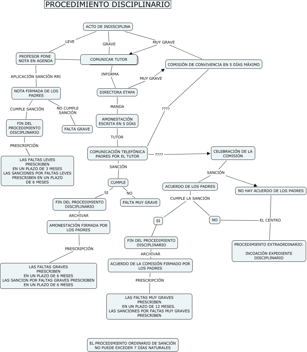 PROCEDIMIENTO DISCIPLINARIO, NO EL CENTRO PROCEDIMIENTO EXTRAORDINARIO: INCOACIÓN EXPEDIENTE DISCIPLINARIO, PROFESOR PONE NOTA EN AGENDA ???? COMUNICA AL TUTOR, PROFESOR PONE NOTA EN AGENDA APLICACIÓN SANCIÓN RRI NOTA FIRMADA DE LOS PADRES, CUMPLE NO FALTA MUY GRAVE, SI ???? FIN DEL PROCEDIMIENTO DISCIPLINARIO, ACTO DE INDISCIPLINA MUY GRAVE COMUNICA AL TUTOR, NOTA FIRMADA DE LOS PADRES NO CUMPLE SANCIÓN FALTA GRAVE, ACUERDO DE LOS PADRES CUMPLE LA SANCIÓN NO, FIN DEL PROCEDIMIENTO DISCIPLINARIO ARCHIVAR AMONESTACIÓN FIRMADA POR LOS PADRES, COMUNICACIÓN TELEFÓNICA PADRES POR EL TUTOR ???? CELEBRACIÓN DE LA COMISIÓN