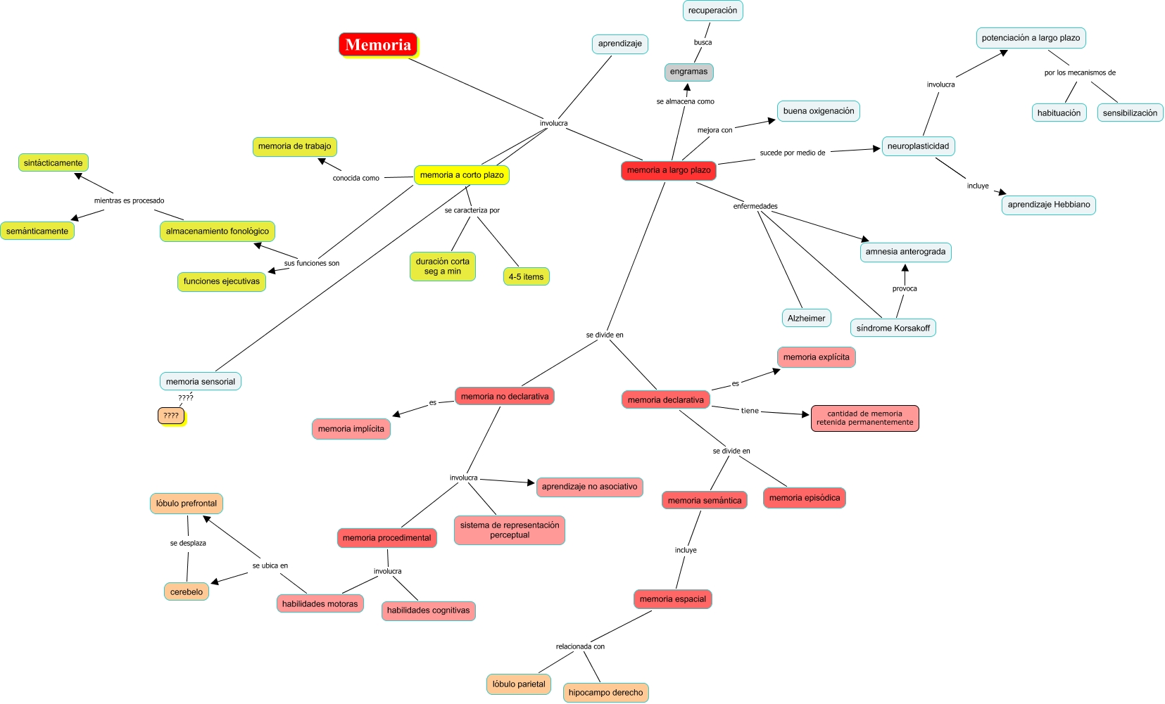 Este Cmap, tiene información relacionada con: Memoria, memoria a corto plazo se caracteriza por duración corta seg a min, aprendizaje involucra memoria sensorial, memoria procedimental involucra habilidades motoras, memoria declarativa tiene cantidad de memoria retenida permanentemente, memoria a corto plazo se caracteriza por 4-5 items, recuperación busca engramas, memoria a largo plazo se almacena como engramas, Memoria involucra memoria sensorial, memoria declarativa se divide en memoria semántica, almacenamiento fonológico mientras es procesado sintácticamente, Memoria involucra memoria a largo plazo, memoria semántica incluye memoria espacial, habilidades motoras se ubica en cerebelo, lóbulo prefrontal se desplaza cerebelo, neuroplasticidad incluye aprendizaje Hebbiano, aprendizaje involucra memoria a corto plazo, memoria a largo plazo mejora con buena oxigenación, almacenamiento fonológico mientras es procesado semánticamente, aprendizaje involucra memoria a largo plazo, memoria a largo plazo se divide en memoria no declarativa