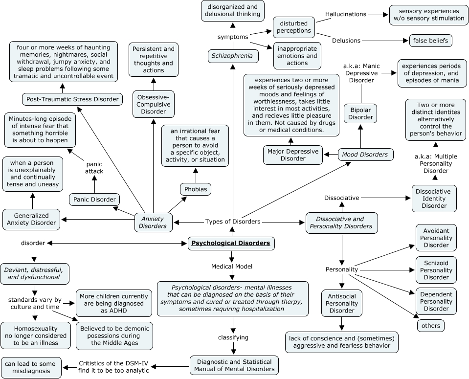 This Concept Map, created with IHMC CmapTools, has information related to: evie briggs pjc 20083, disturbed perceptions Delusions false beliefs, Dissociative and Personality Disorders Personality Antisocial Personality Disorder, Major Depressive Disorder ???? experiences two or more weeks of seriously depressed moods and feelings of worthlessness, takes little interest in most activities, and recieves little pleasure in them. Not caused by drugs or medical conditions., Psychological Disorders Types of Disorders Schizophrenia, Dissociative and Personality Disorders Personality Dependent Personality Disorder, Psychological Disorders Types of Disorders Dissociative and Personality Disorders, Dissociative and Personality Disorders Personality Schizoid Personality Disorder, Psychological disorders- mental illnesses that can be diagnosed on the basis of their symptoms and cured or treated through therpy, sometimes requiring hospitalization classifying Diagnostic and Statistical Manual of Mental Disorders, Dissociative and Personality Disorders Personality others, Psychological Disorders Medical Model Psychological disorders- mental illnesses that can be diagnosed on the basis of their symptoms and cured or treated through therpy, sometimes requiring hospitalization, Dissociative Identity Disorder a.k.a: Multiple Personality Disorder Two or more distinct identites alternatively control the person's behavior, Anxiety Disorders ???? Post-Traumatic Stress Disorder, Deviant, distressful, and dysfunctional standards vary by culture and time Believed to be demonic posessions during the Middle Ages, Dissociative and Personality Disorders Dissociative Dissociative Identity Disorder, Anxiety Disorders ???? Obsessive- Compulsive Disorder, Generalized Anxiety Disorder ???? when a person is unexplainably and continually tense and uneasy, Panic Disorder panic attack Minutes-long episode of intense fear that something horrible is about to happen, Dissociative and Personality Disorders Personality Avoidant Personality Disorder, Schizophrenia symptoms disturbed perceptions, Phobias ???? an irrational fear that causes a person to avoid a specific object, activity, or situation