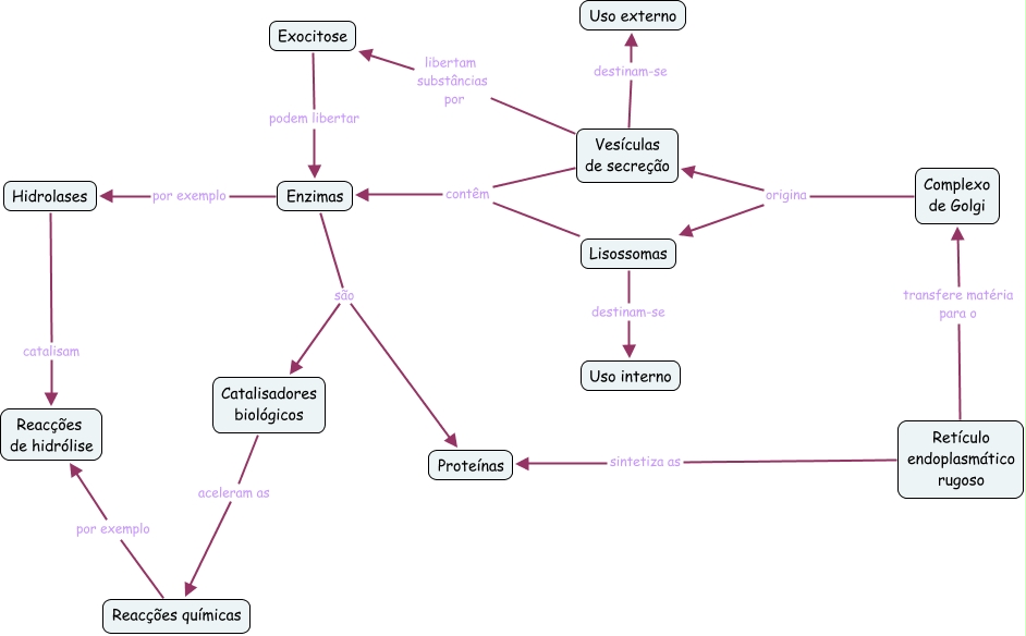 Esse mapa conceitual, produzido no IHMC CmapTools, tem a informação relacionada a: Aula_dia_15.2.08DENISE10B, Vesículas de secreção destinam-se Uso externo, Lisossomas contêm Enzimas, Retículo endoplasmático rugoso sintetiza as Proteínas, Vesículas de secreção libertam substâncias por Exocitose, Retículo endoplasmático rugoso transfere matéria para o Complexo de Golgi, Complexo de Golgi origina Vesículas de secreção, Hidrolases catalisam Reacções de hidrólise, Exocitose podem libertar Enzimas, Lisossomas destinam-se Uso interno, Vesículas de secreção contêm Enzimas, Reacções químicas por exemplo Reacções de hidrólise, Complexo de Golgi origina Lisossomas, Enzimas são Proteínas, Catalisadores biológicos aceleram as Reacções químicas, Enzimas são Catalisadores biológicos, Enzimas por exemplo Hidrolases